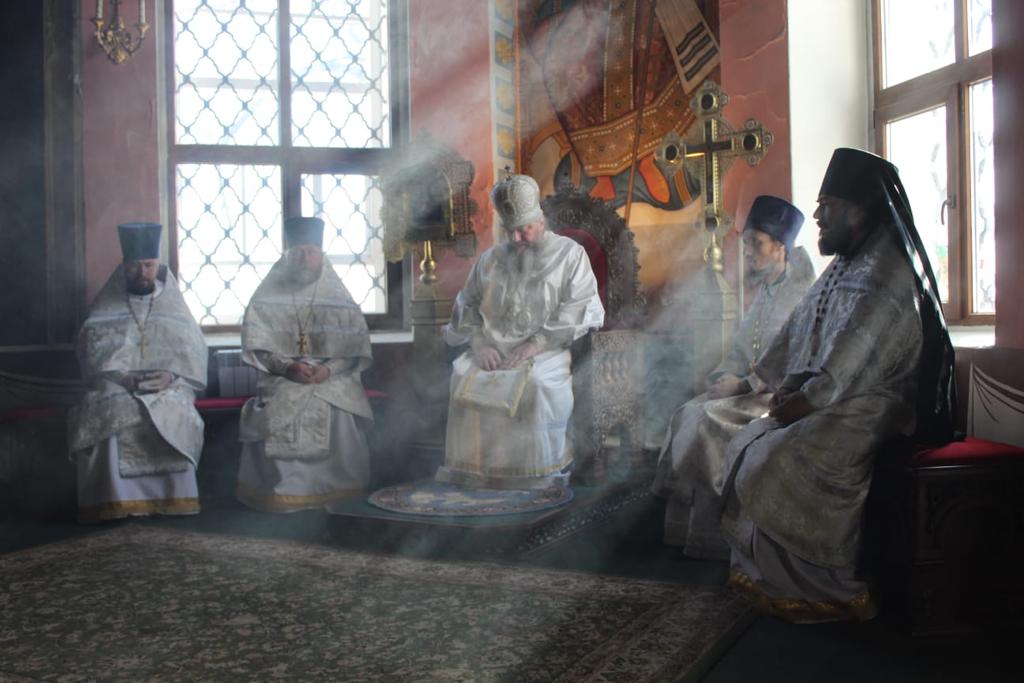 По заамвонной молитве Преосвященный святитель благословил хлеб и вино.