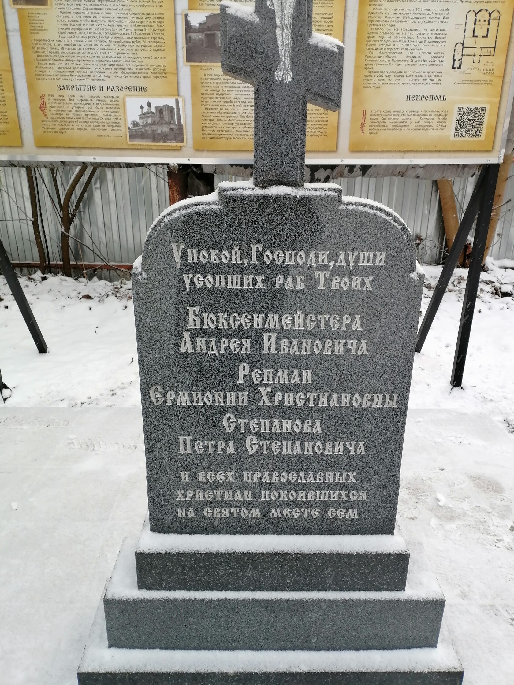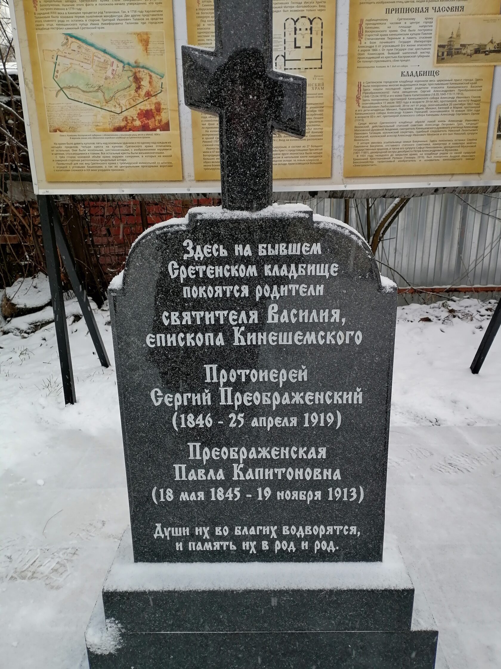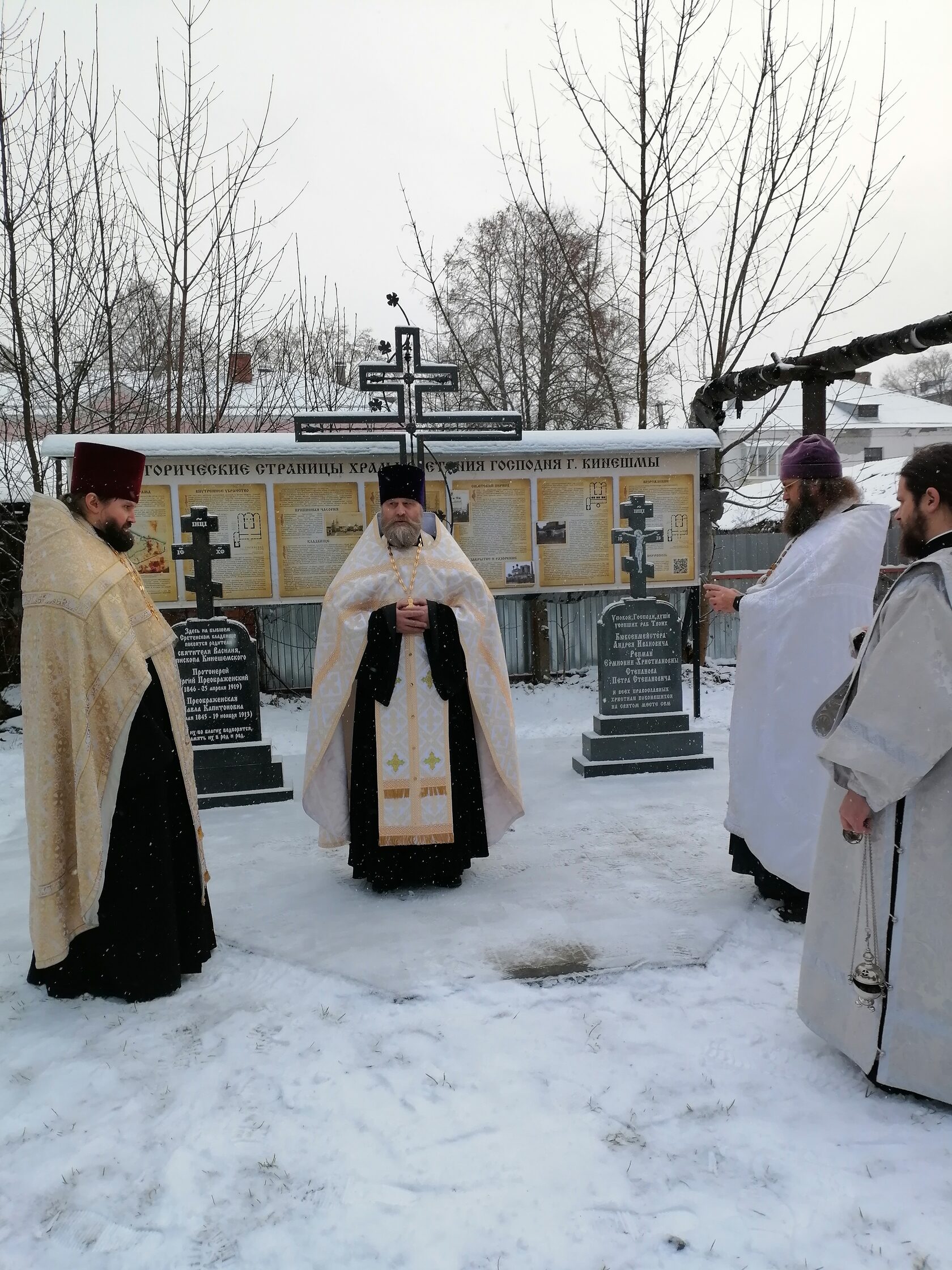 10 декабря на территории бывшего кладбища храма Сретения Господня г. Кинешма состоялось открытие исторического мемориала на месте захоронения жителей Кинешмы: Бюксенмейстера А.И., Репман Е.Х., Степанова П.С. и родителей святителя Василия, епископа Кинешемского, протоиерея Сергия и Павлы Капитоновны Преображенских.